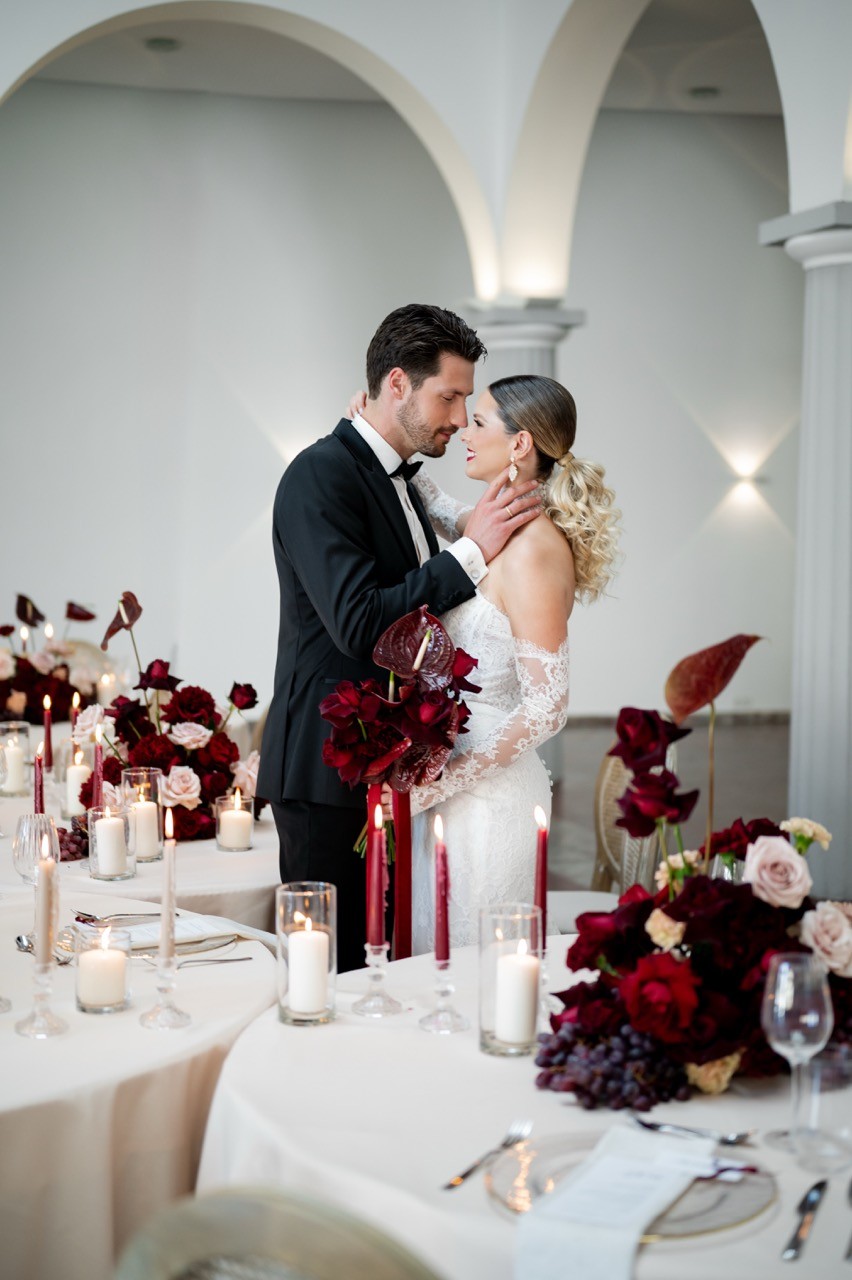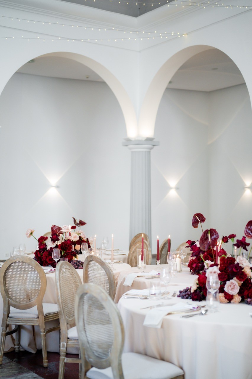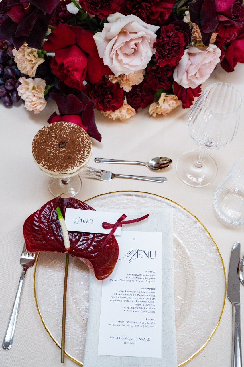 Feiert Eure Hochzeit im Palais Schloss Wachenheim im eleganten Farbkonzept Red Velvet. Der helle Marmorsaal wird durch stilvolle rote Tischdekoration zu einer unvergesslichen Kulisse für festliche Momente voller Charme und Eleganz.