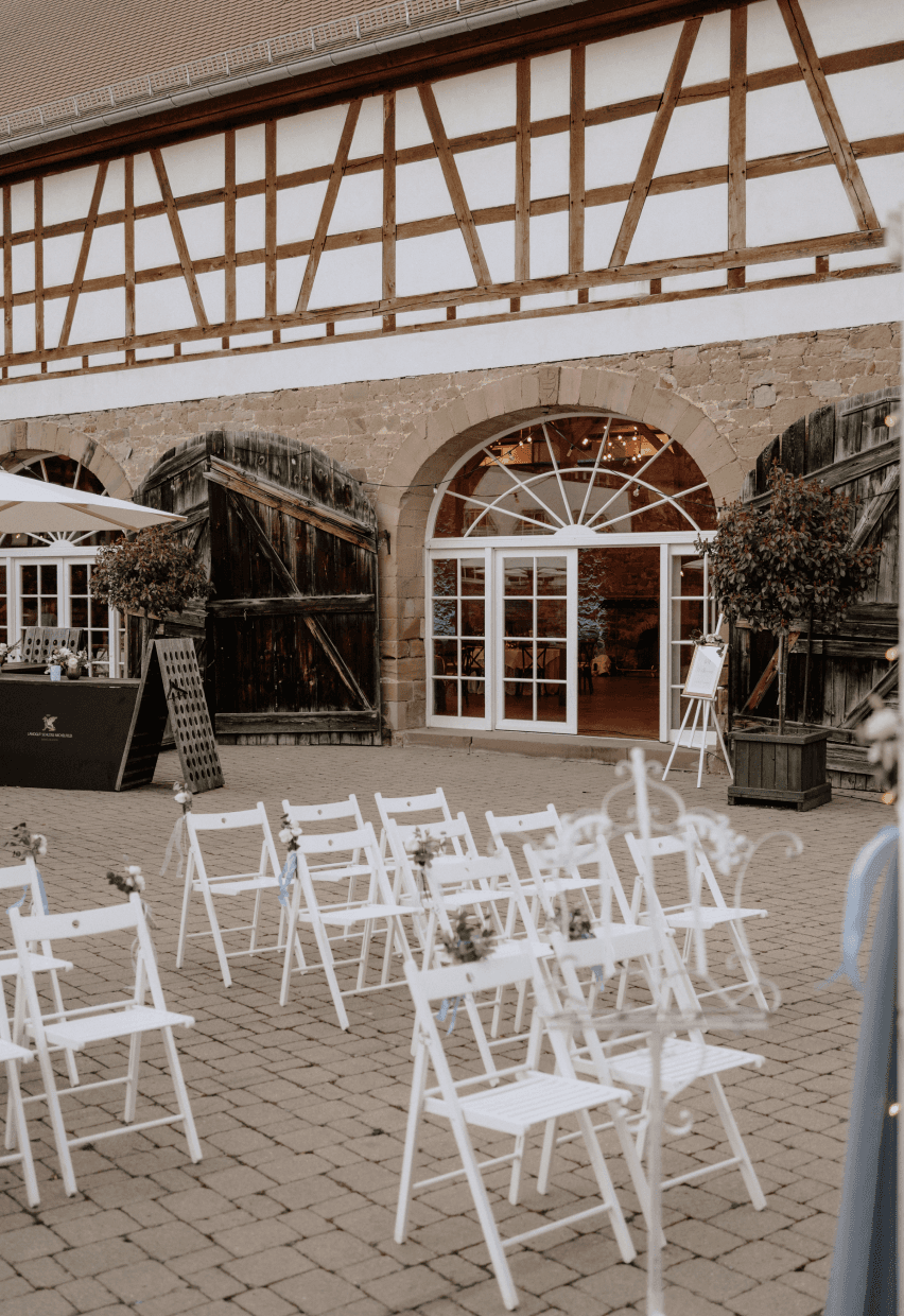 Feiert Eure Hochzeit auf dem Gutshof Ladenburg – romantisch, charmant und unvergesslich. Genießt den Sektempfang unter Kastanien im Innenhof und Eure Freie Trauung wahlweise im grünen Park oder im eleganten Rundbogensaal.