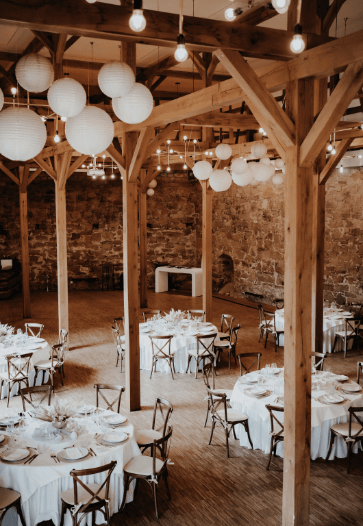Feiert Eure Scheunenhochzeit im Eichenstolz mit rustikalem Charme. Der wunderschöne Galeriesaal lädt zum stilvollen Essen ein, danach steigt die Party im beeindruckenden großen Speicher. Lichterketten, altes Gemäuer und markante Holzbalken schaffen eine unvergessliche Atmosphäre.